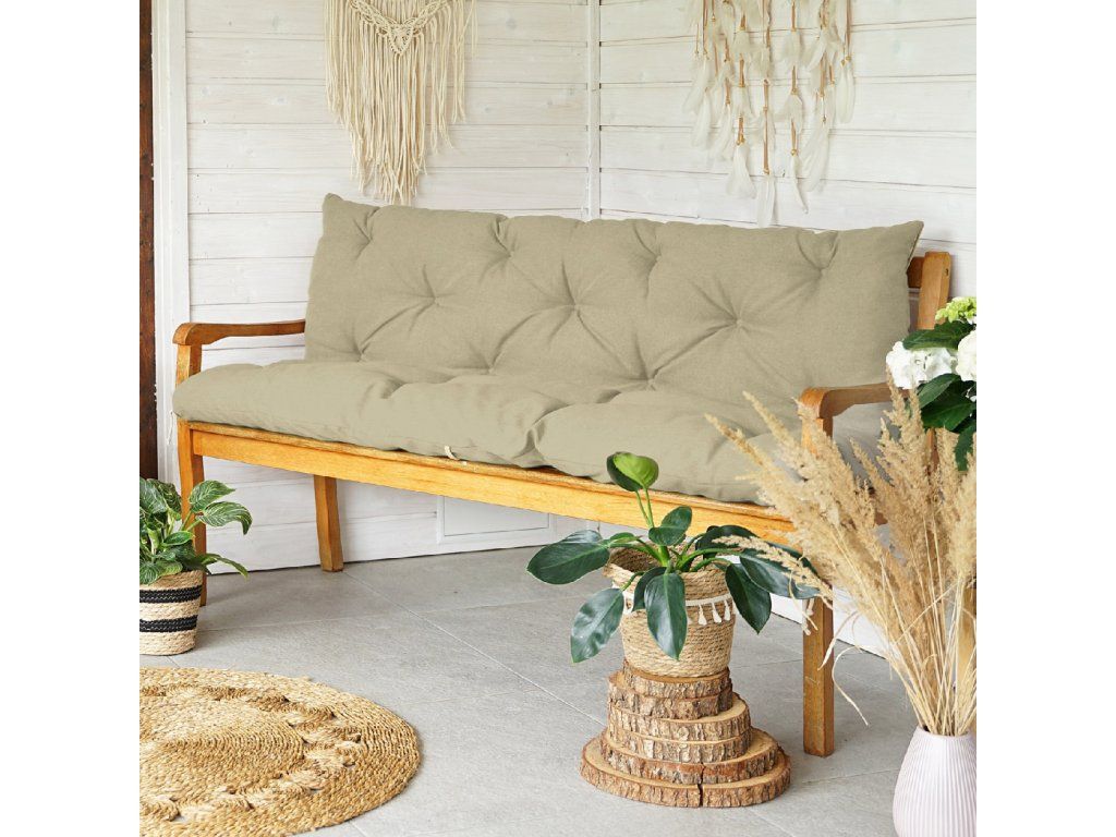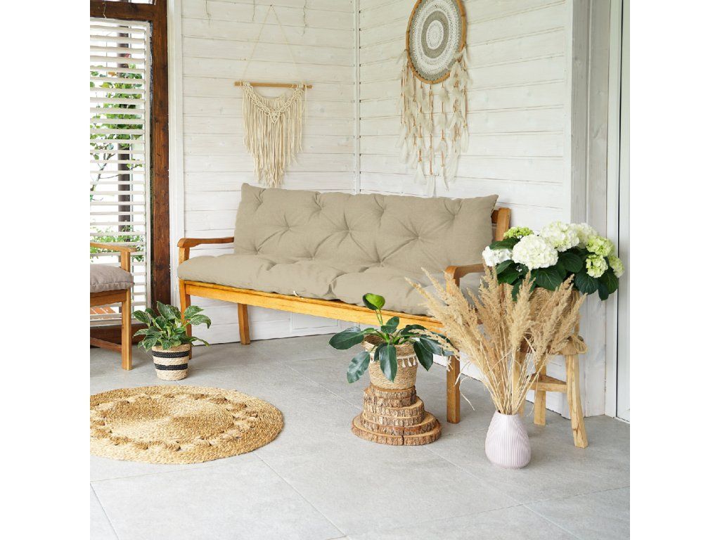 Oboustranné polštáře pro zahradní lavičky jsou vyrobeny z voděodolné potahové látky, odolné proti oděru a roztržení. Látka je měkká, šetrná k pokožce a svým vzhledem připomíná bavlnu, což dodává elegantní nádech. Díky odolnosti proti UV záření barvy nevyblednou ani po mnoha slunečných dnech.